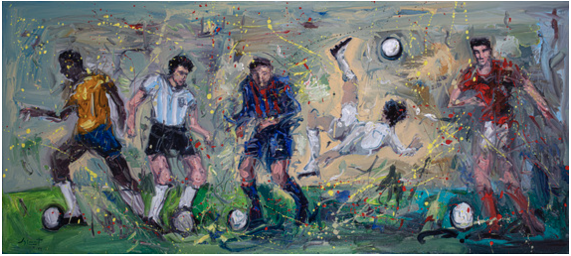 Jazzamoart’s work centers on soccer as a universal connector — a shared cultural force that crosses borders, unites strangers, and pulses with the rhythm and color of the communities that love it. His bold, expressive canvases are not portraits of the game; they’re translations of its energy, movement, and meaning into paint. With over 50 years of practice behind him, his work is rooted in the same world as jazz and blues — art forms that speak directly to the body before they reach the mind.