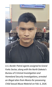 Border Patrol agents in North Dakota arrested an illegal alien from Mexico on February 6 after discovering child sexual abuse material on his phone during a federal search warrant execution.