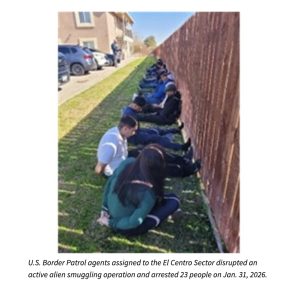 Border Patrol agents disrupted an active human smuggling operation in California on January 31, arresting 19 illegal aliens and four suspected smugglers in a coordinated enforcement action.