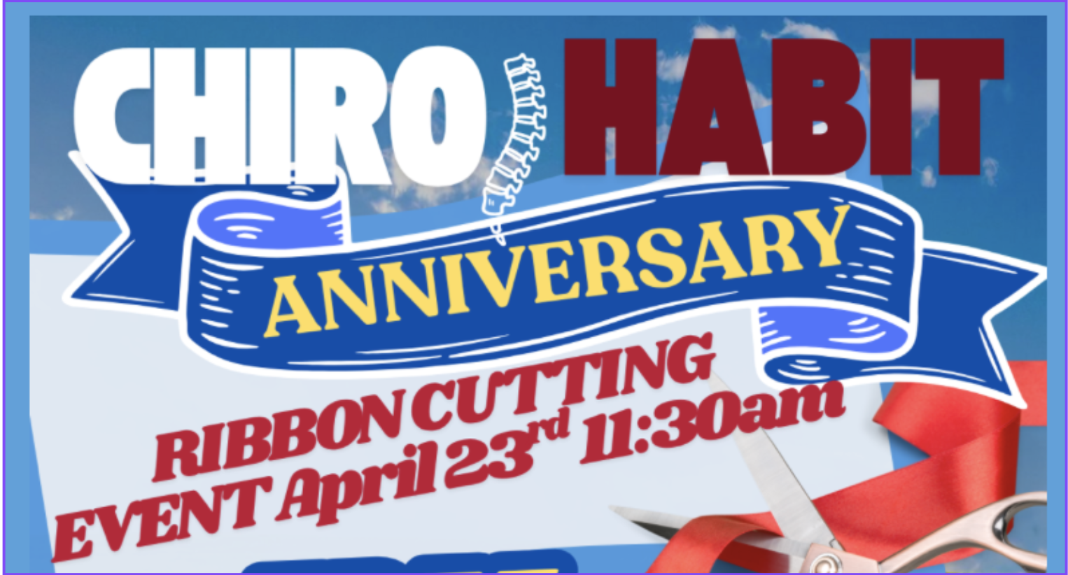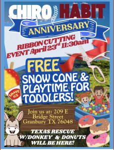 Event: ChiroHabit Anniversary Ribbon Cutting Date: Thursday, April 23, 2026 Time: 11:30 a.m. Location: 209 E. Bridge Street, Granbury, TX 76048 Cost: Free Activities: Ribbon cutting, free snow cones and shave ice, toddler playtime, Texas Rescue donkey visit, donuts