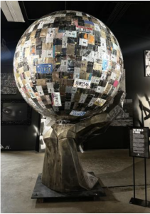 The World Is Ours stands eight feet wide and twelve feet high. At its center, a bold bronze hand lifts an immense, gently rotating globe — engineered from repurposed spray cans and embellished with vibrant license plates collected from countries around the world. The result is a work that blends street art, sculpture, engineering, and global identity into something that stops people in their tracks.
