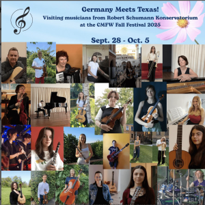 Sunday, September 28: “Germany Meets Texas” (4:00-5:30 PM) The festival opens at Covenant United Methodist Church (4410 Duval Rd) with visiting musicians performing alongside local artists. This opening concert sets the tone for the entire week – showing how musical traditions from different continents can create something beautiful together.