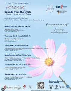 Sunday, October 5: Grand Finale “Concert for All: Music to Heal” (4:00-6:00 PM) The week concludes with the festival’s most ambitious event at Covenant United Methodist Church. This grand finale brings together all the week’s participants – German visitors, local musicians, and the Austin community – for a concert focused on music’s power to heal and unite.
