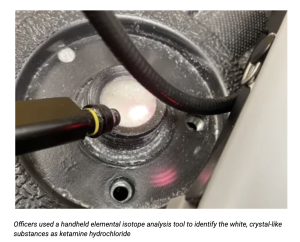 A handheld elemental isotope analysis tool tested samples of the white crystalline substances. The tool provides rapid identification of chemical compounds through elemental analysis—determining the molecular signature of the substance.