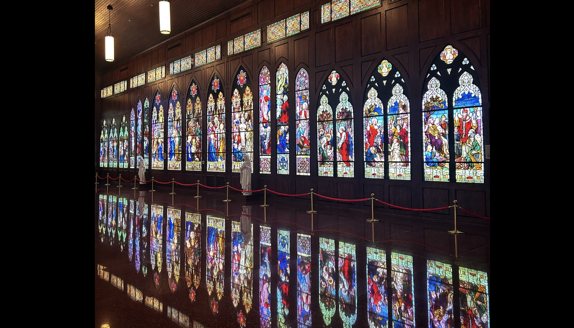 The museum building itself is designed to replicate European medieval cathedral architecture. A Latin-cross layout. High ceilings. Dark red-oak walls. But here’s what makes it unique: none of the windows on the exterior. Every single stained-glass window is protected inside, illuminated by custom LED systems designed to mimic natural sunlight.