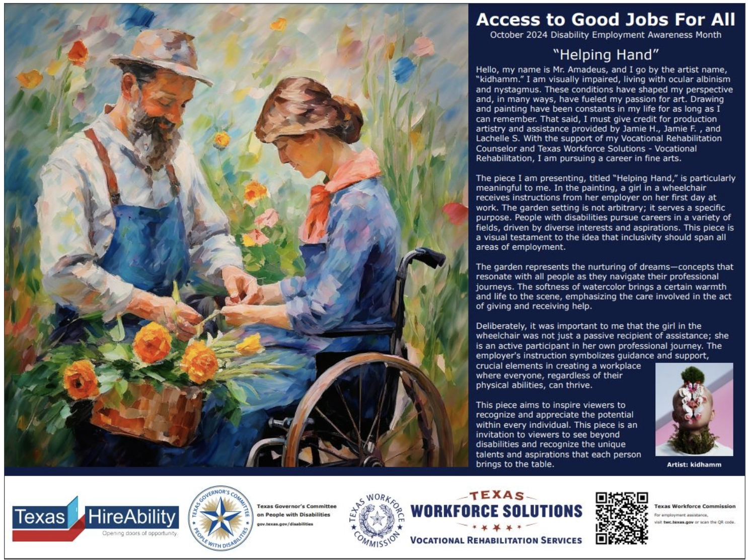 Each year, one artist is selected to have their work featured in the official DEAM poster, a piece that will be distributed to over 2,000 businesses, organizations, and government offices statewide. The winning design will also be showcased in the Texas HireAbility Campaign and honored during the prestigious Lex Frieden Employment Awards ceremony.