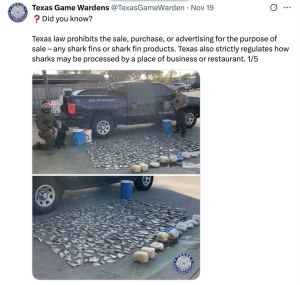 This isn’t just a law on the books. In 2022, nearly 400 shark fins were found at a San Antonio seafood restaurant and confiscated by Texas Game Wardens. Game Wardens have filed Class B misdemeanor charges on restaurants and markets in the Houston and Dallas area for selling shark fins and shark fin products.