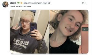 Claire has been detransitioning for about three years. Now 20 years old, she speaks publicly about her experience. “I was always just a girl with trauma with a hard relationship with her body,” she said.